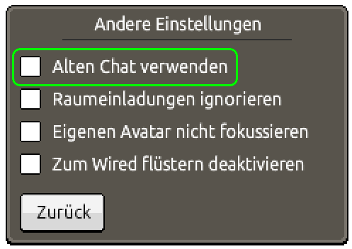 Wir versuchen, die Chateinstellungen aus den Raumeinstellungen herauszunehmen und sie statt dessen in persönliche Präferenzen zu verwandeln! So könnt ihr euch aussuchen, wie sich euer Chat verhält und wie er aussieht ohne dass es von den Raumeinstellungen anderer abhängt.